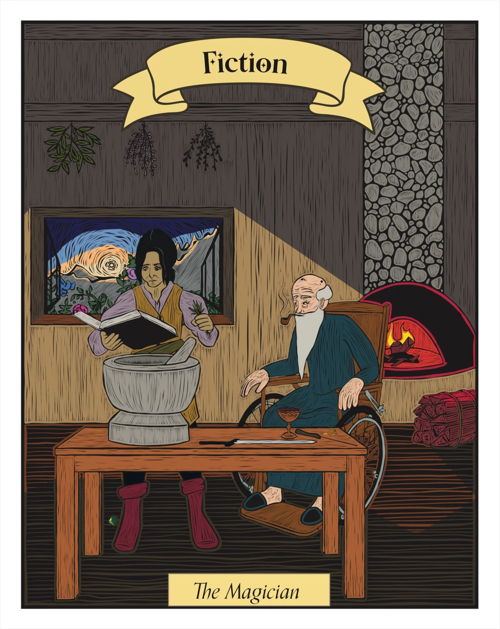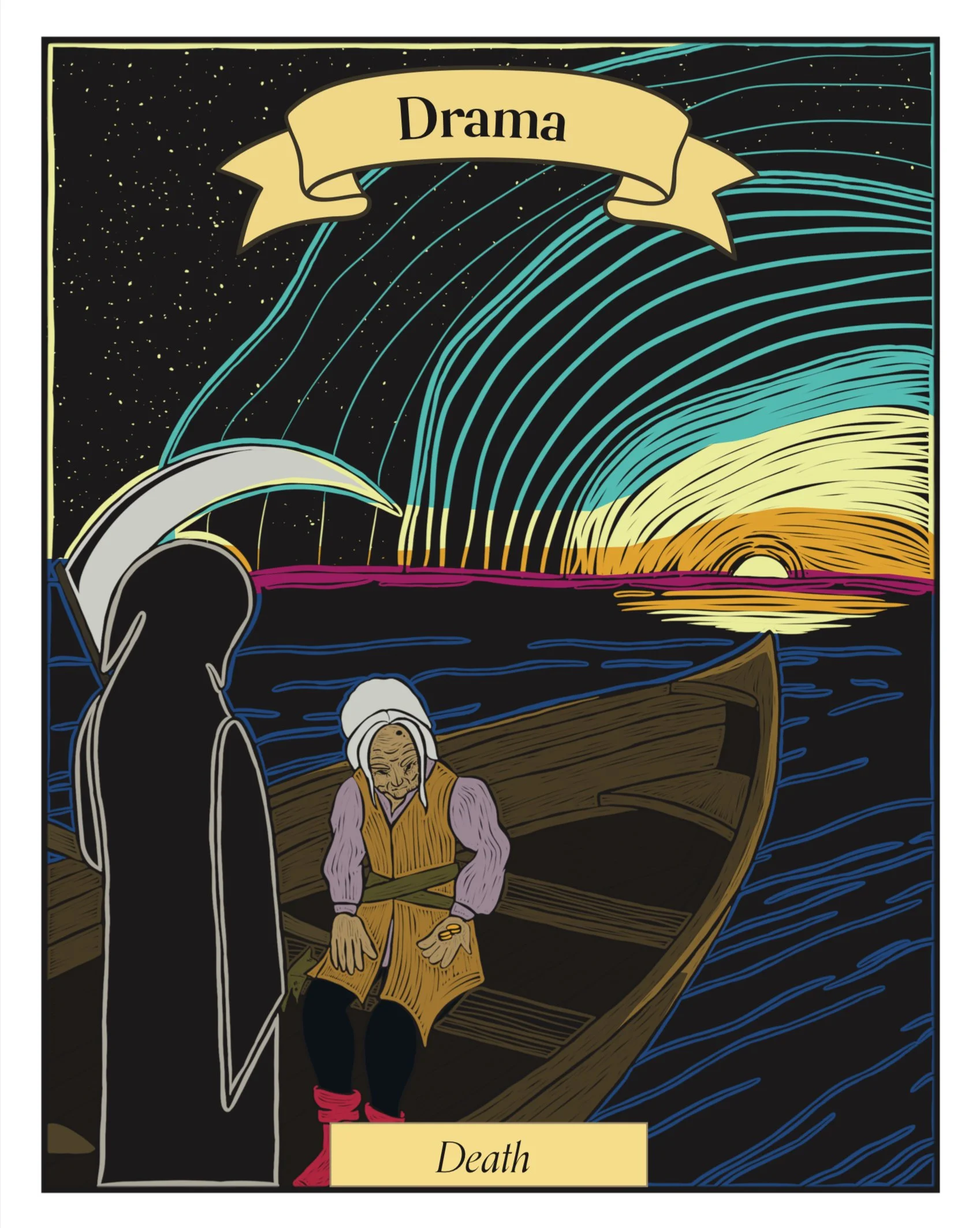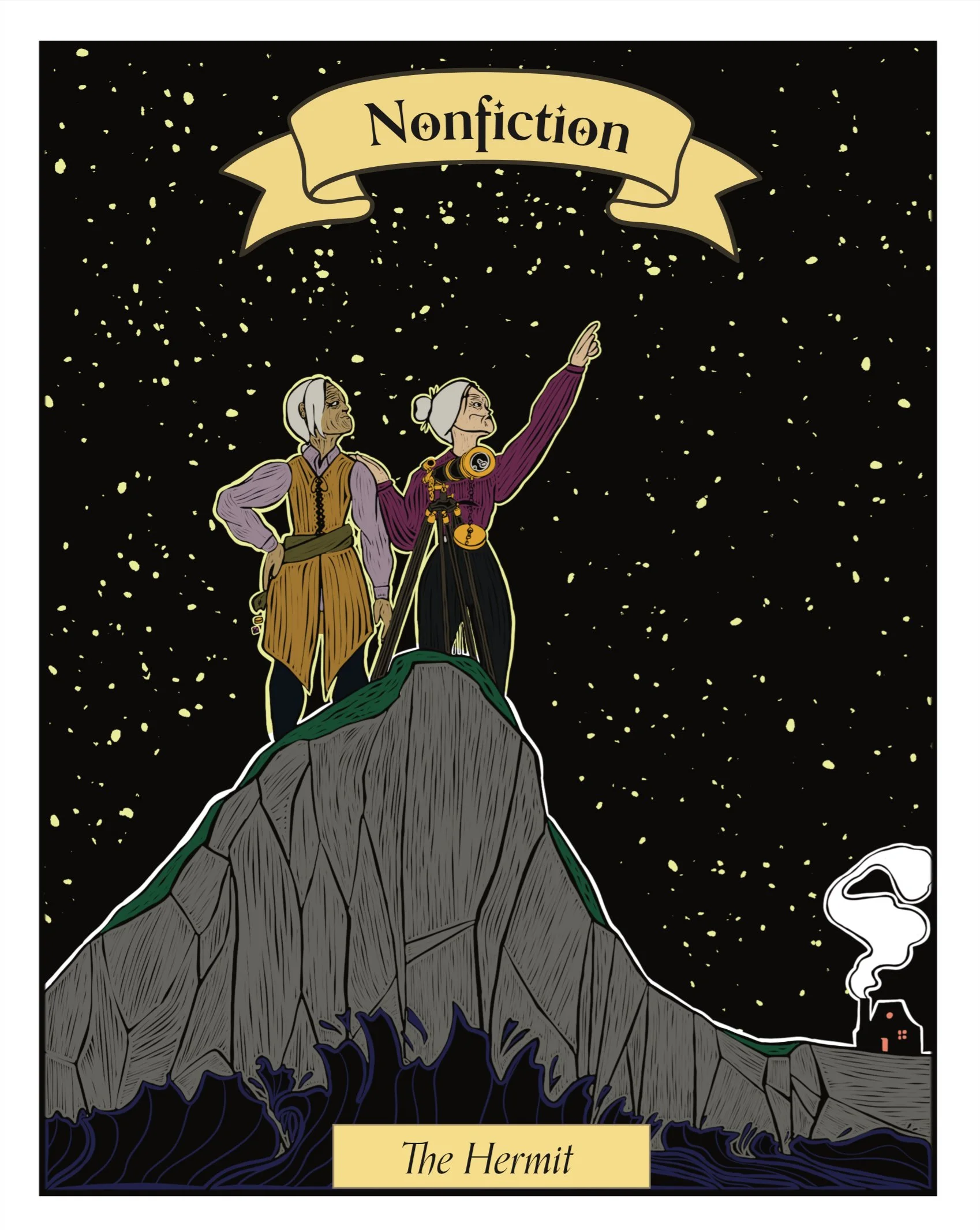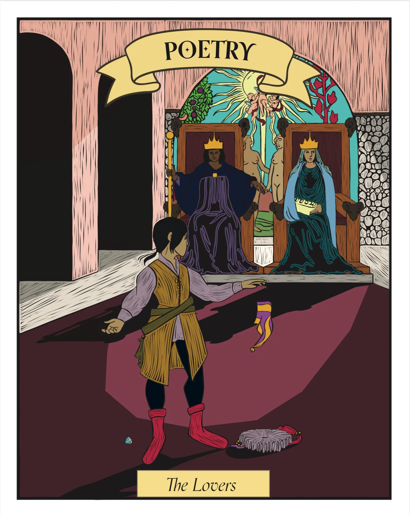 I was given one of the biggest honors of my career, fully illustrate the 60th edition of Progenitor. Progenitor is my colleges book they do every spring, it’s a huge collaboration between two classes. Then it usually gets entered into competitions which Progenitor has won several times. Being asked to fully illustrate the book was a challenge but a rewarding one. Each illustration is done in relief much like a wood stamp, then colored like layered ink. Each one based off a card in a tarot deck that encompasses the section of the book. However unlike a normal tarot deck it follows a singular person traveling through their life to find their purpose.